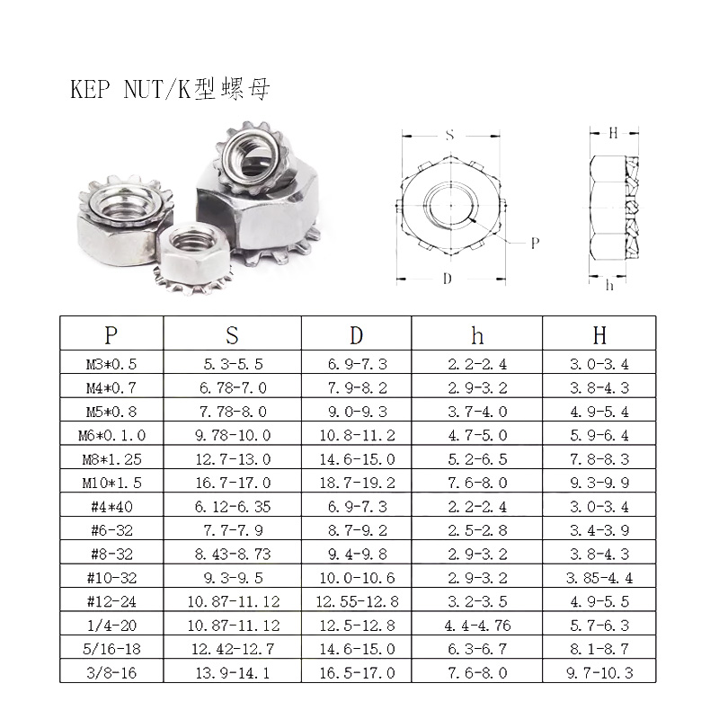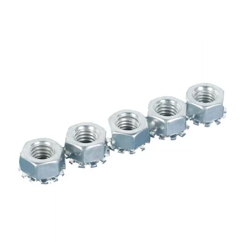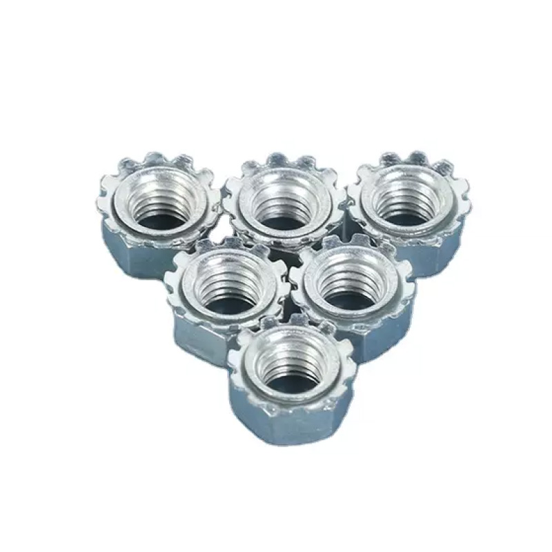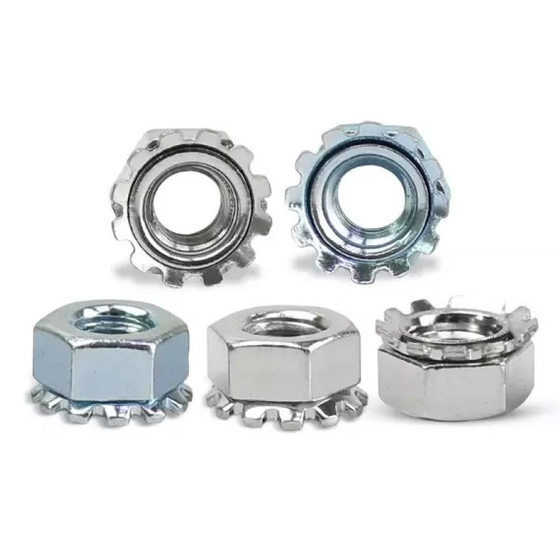 K nut is one of the common nuts, hexagonal shape, at one end of the hexagonal nut using stamping pressed into a removable flower teeth, in the process of locking using the elasticity of the flower teeth and skid resistance to achieve the purpose of locking and loosening. K nut is easy to use in different area, obviously locking effect and widely used in electrical appliances, furniture, sports equipment, mechanical assembly and other industries.