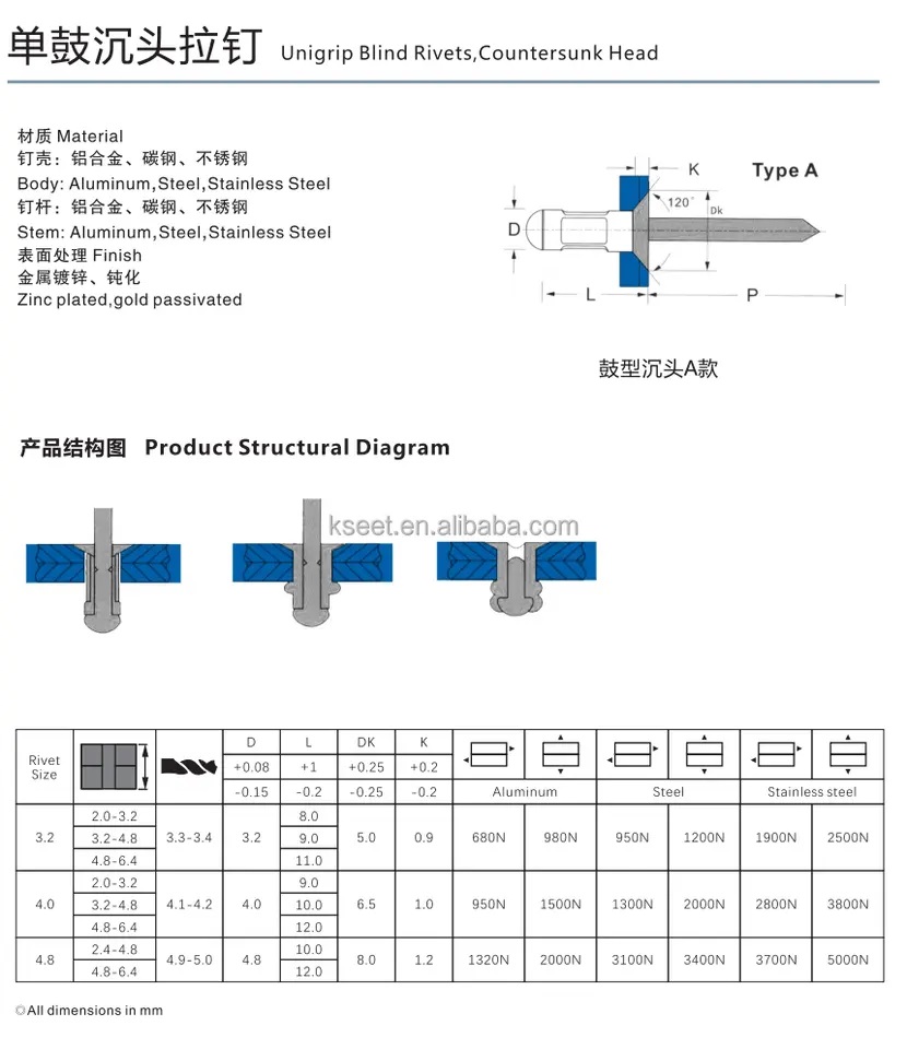 Item | Finely processed Steel unigrip type Countersunk Head blind rivet at competitive price | |||||||
