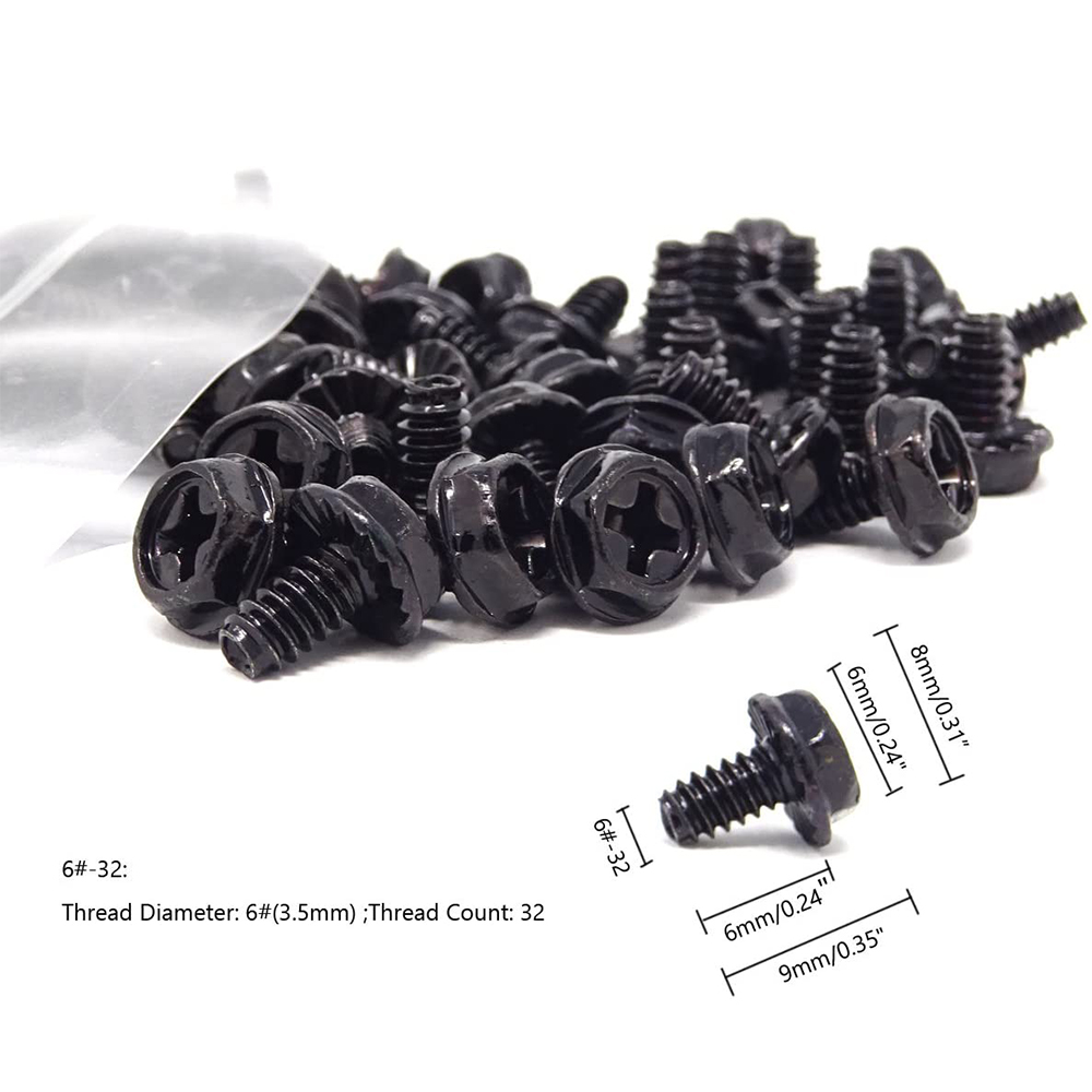 Most screws in a computer are UTS 6-32 screws. 6-32 screws are used for your power supply, 3.5" hard drives, securing expansion cards, and the case panels. The other common screw type is the metric M3×0.5 screw, which are used for mounting optical drives, floppy drives, and the motherboard.