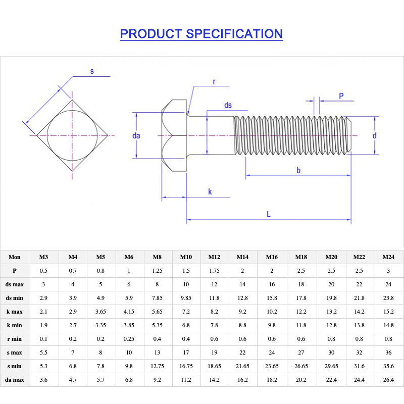 The usual diameter of the square head machine bolt is 3/8inch, 1/2inch, 5/8inch, and 3/4inch. The length of the square head machine bolt is according to the application. The widely used length is 2inch, 3inch, 10inch, 12inch, 14inch.