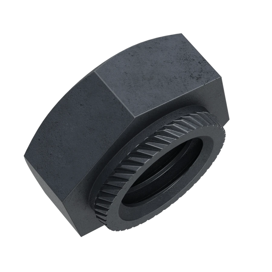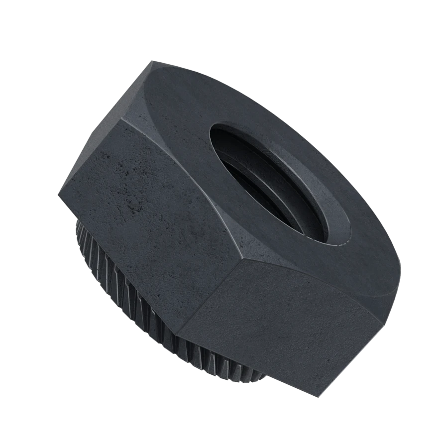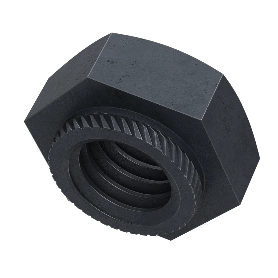 When pressed into ductile material, a self clinching fastener (commonly referred to as a clinch nut or press nut) displaces the host material around the mounting hole, causing it to cold flow into a specially designed annular recess in the shank or pilot of the fastener.