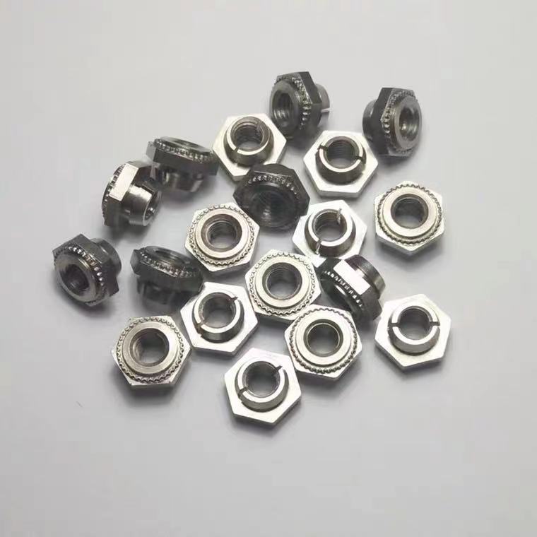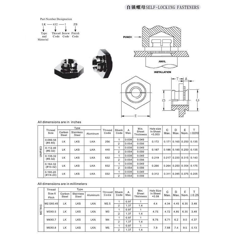 Self-clinching nuts are installed by placing them in properly sized holes in sheets and applying a parallel squeezing force to the head of the nut. The sheet metal surrounding the head cold flows into an undercut thereby making the fastener an integral part of the sheet. A serrated clinching ring prevents the fastener from rotating after installation.