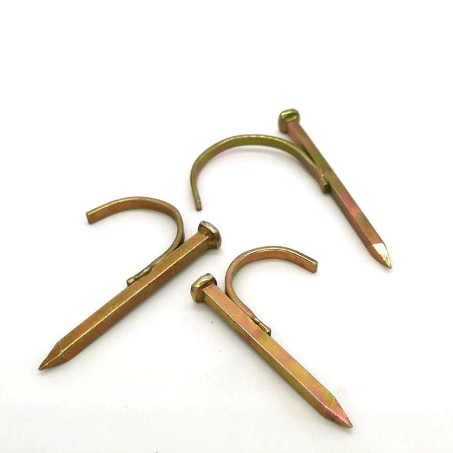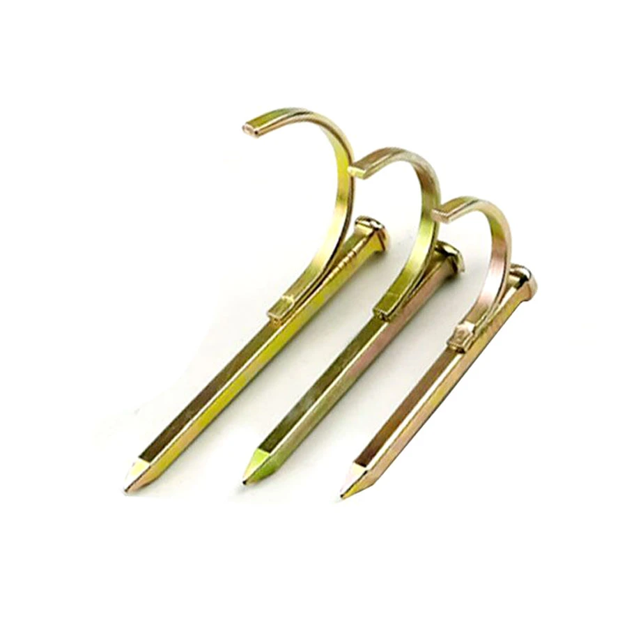 Hook nails are a product used to join various materials. It consists of a metal hook with at least one hook head and a cylindrical pin. The elastic groove on the hook can be opened into two halves, or it can be used without opening the two halves. When using, insert the hook into the pre-processed hole, and then drive the cylindrical pin by hitting, so that the hook head on the hook is embedded in the connected materials to achieve the purpose of connection.