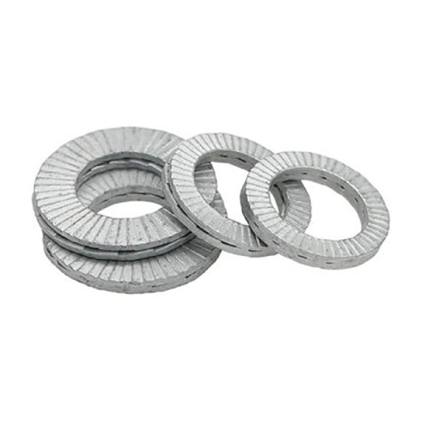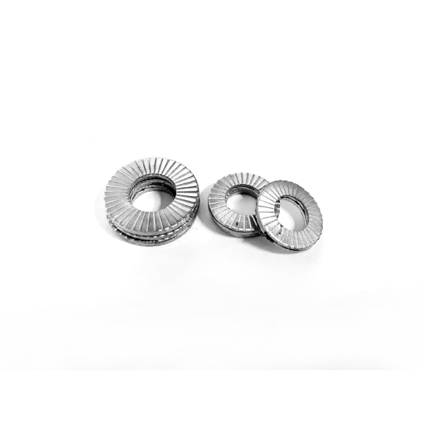 Lock washer is also known as lock washer, self-locking washer, din25201 lock washer, double stacked self-locking lock washer, double stacked wedge lock washer, etc. The lock washer is composed of two gaskets of uniform specification. The outer side of each gasket is provided with a radial convex surface, and the inner side is a helical tooth surface. The tension between the two gaskets is used to achieve the dual effect of locking and tightening. The basic materials are carbon steel and stainless steel.