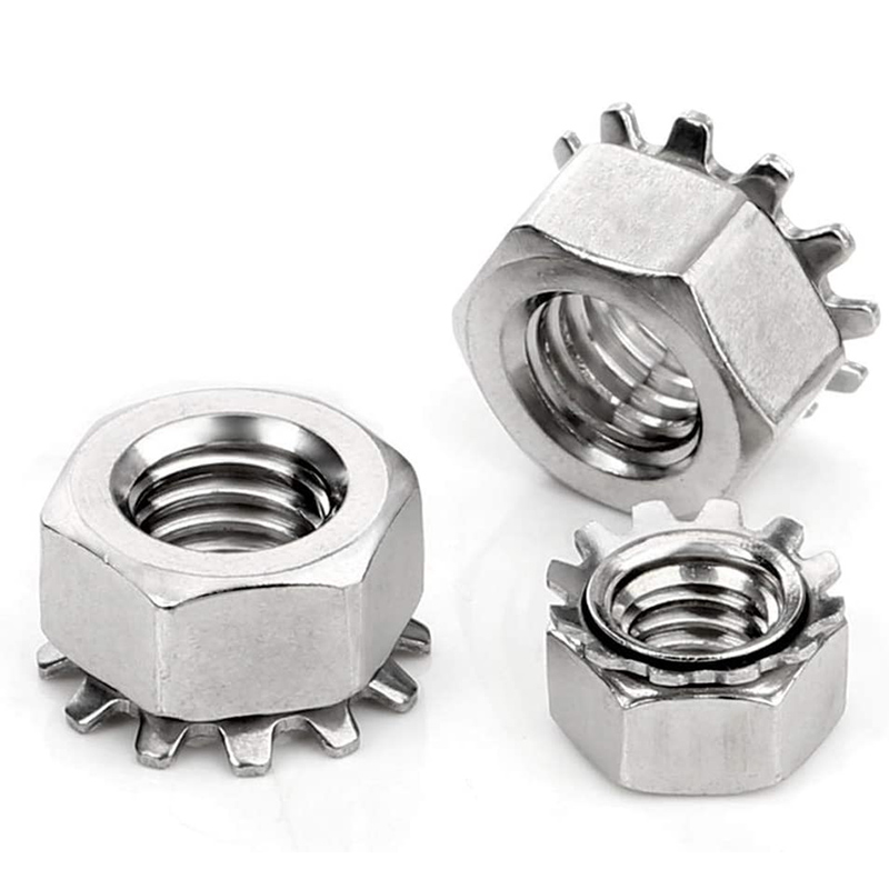 K nut is one of the common nuts, hexagonal shape, at one end of the hexagonal nut using stamping pressed into a removable flower teeth, in the process of locking using the elasticity of the flower teeth and skid resistance to achieve the purpose of locking and loosening. K nut is easy to use in different area, obviously locking effect and widely used in electrical appliances, furniture, sports equipment, mechanical assembly and other industries.