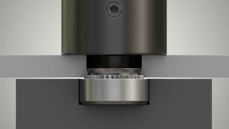 Usando um punção, aplique apenas pressão suficiente para “espremer” as porcas serrilhadas na folha principal.